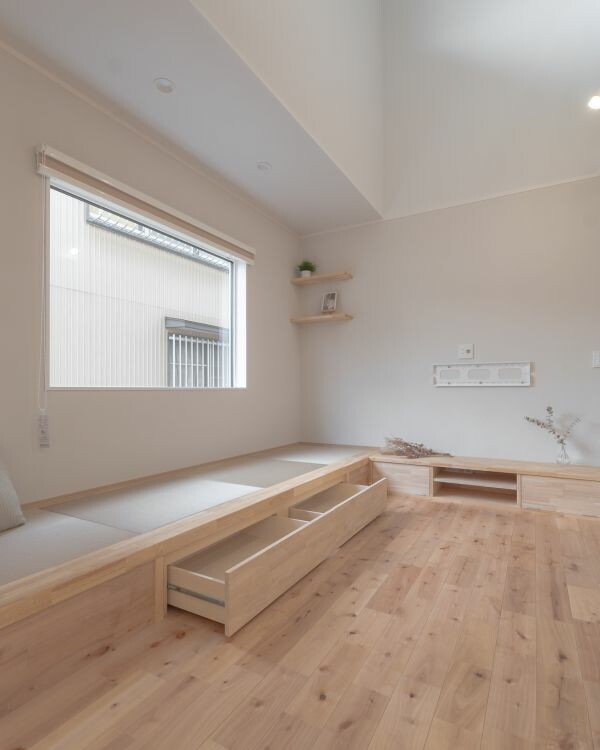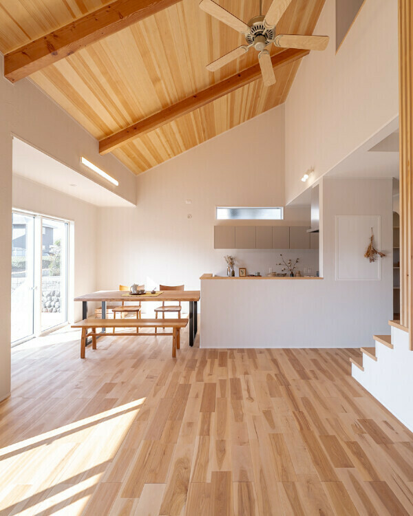 浜松市にあるモデルハウス「Kinari」は、無垢の床や塗り壁など、自然素材や木のぬくもりを存分に感じられる内装デザインが特徴です。大きな窓から光が差し込む、明るく開放的な吹き抜け空間。断熱・気密・遮音性にもこだわり、断熱等級6(G2)の快適な住環境をご体感いただけます。