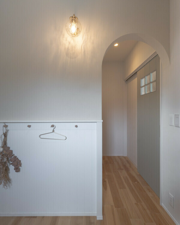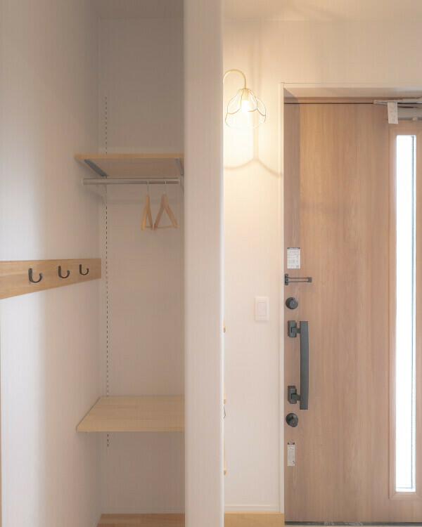 ちょっとした棚板やフックを取り入れるだけでも、玄関の雰囲気がぐっと変わり、気持ちまで整うような心地よさに。