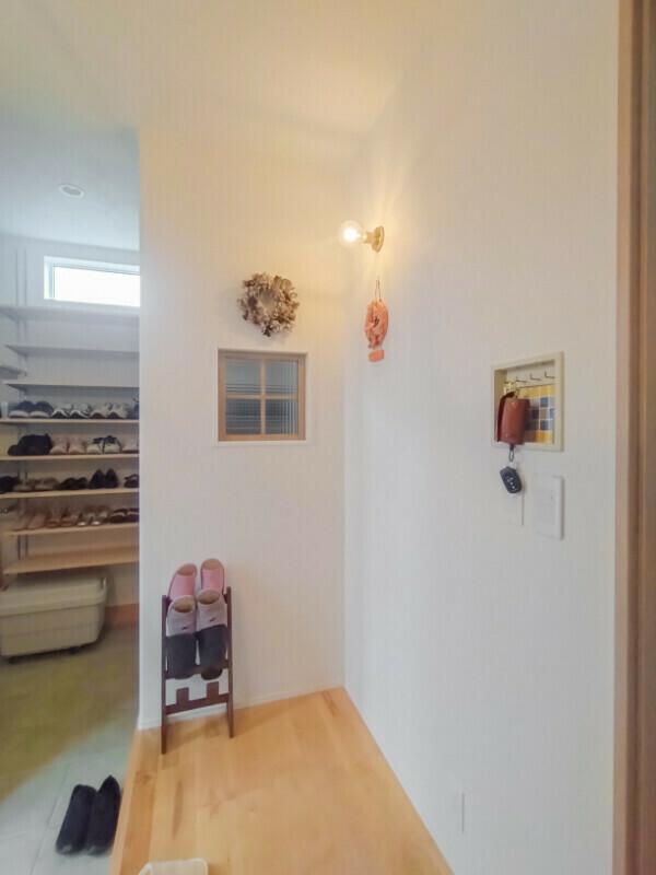 壁にはお気に入りのリースや小物が飾られ、訪れる人や帰ってきた家族をあたたかくお出迎え。