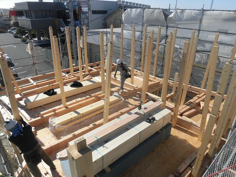 上棟日には柱や梁などの建物の基本構造となる部分の組み立て作業を大工さん数人掛かりで行います。
