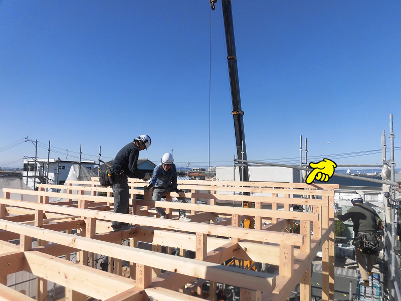 2階の梁を組み終えると、次の作業がいよいよ棟上げです。