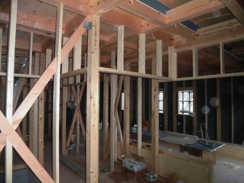 耐震上で必要となる筋交いや、間仕切壁の柱間に設置される間柱、建具上に付くまぐさ等、プレカットして現場納入された部材の取付け作業も完了し、更に角打ちと言って、入り隅(引っ込んだ角)に野縁を取付ける作業まで進みました。