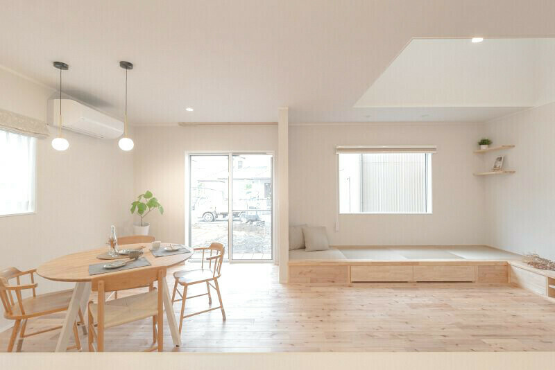 ダイニングと小上がりの畳コーナーがゆるやかにつながるリビング。