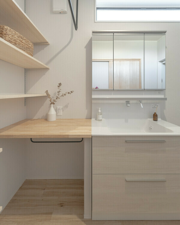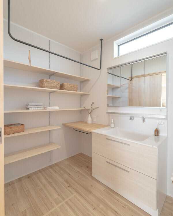 洗面脱衣室には、使い勝手の良い簡易物干し・可動棚・カウンターが完備。