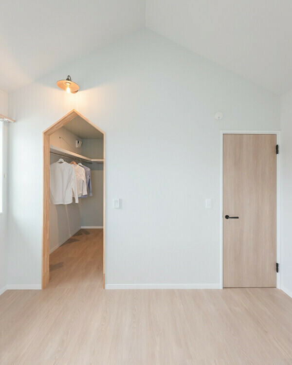 天井がお家型になった寝室。ウォークインクローゼットも同じ三角形のデザイン。