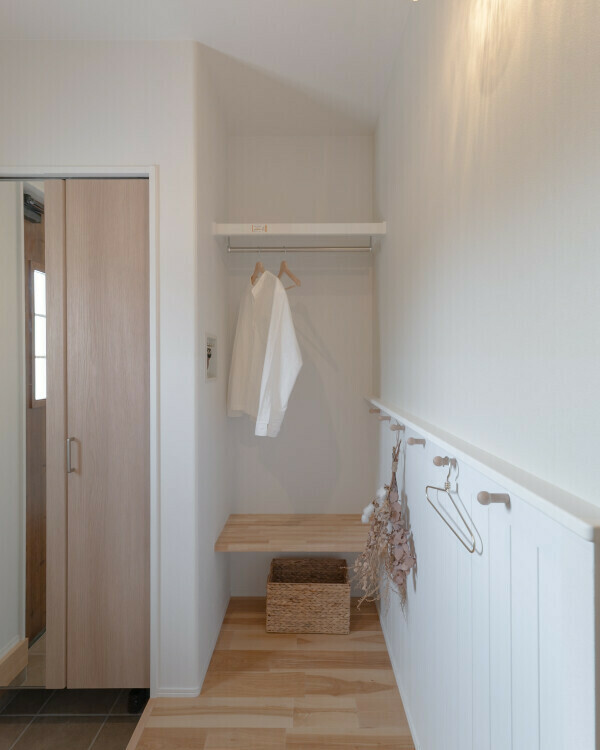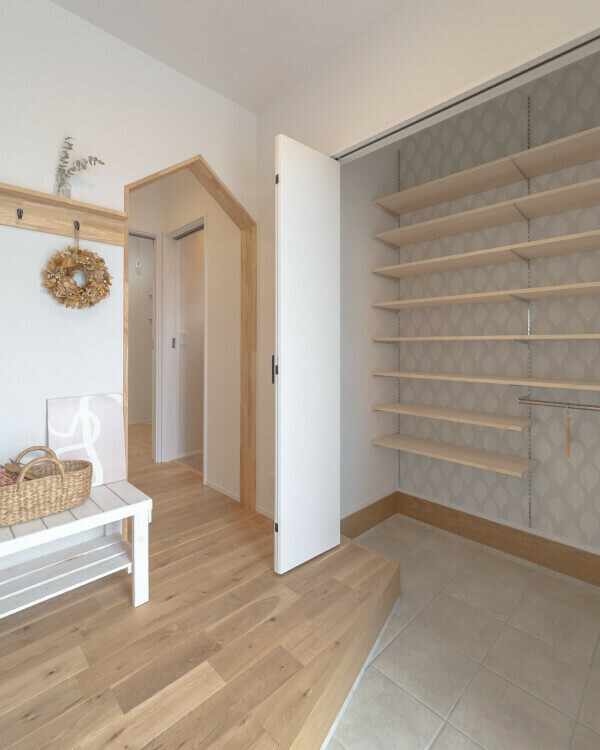 ちょっとした棚板やフックを取り入れるだけでも、玄関の雰囲気がぐっと変わり、気持ちまで整うような心地よさに。