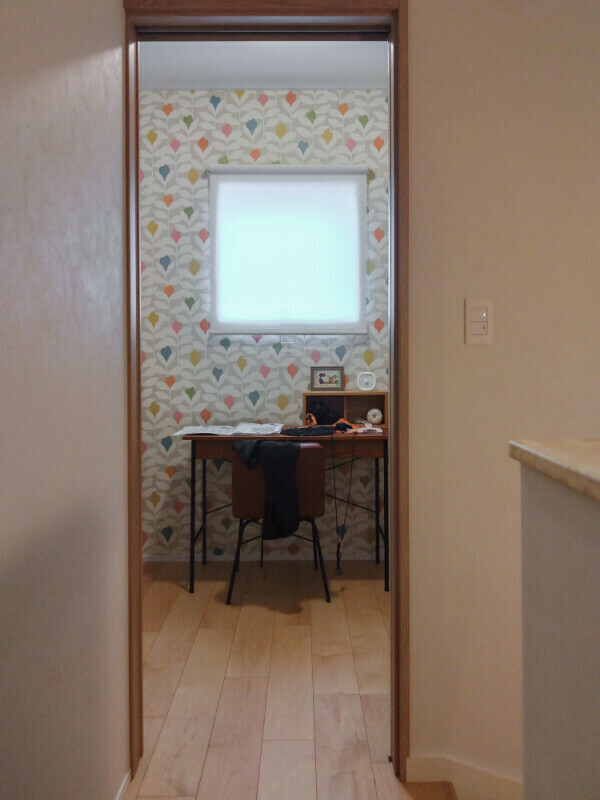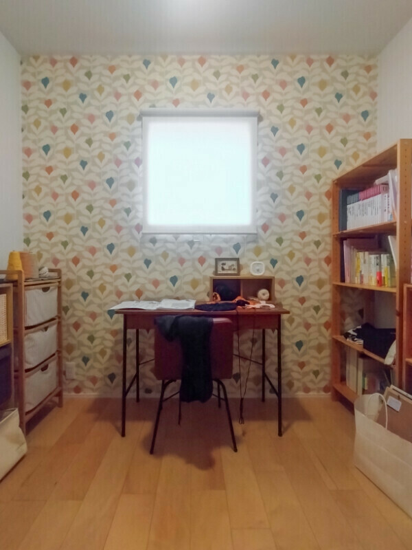 可愛らしい北欧柄のアクセントクロスが印象的な書斎。