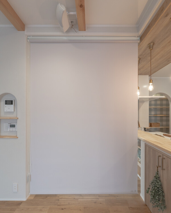畳コーナーはロールスクリーンで間仕切りが可能。子どもがお昼寝している時も、リビングからの視線を程よく隠せます。