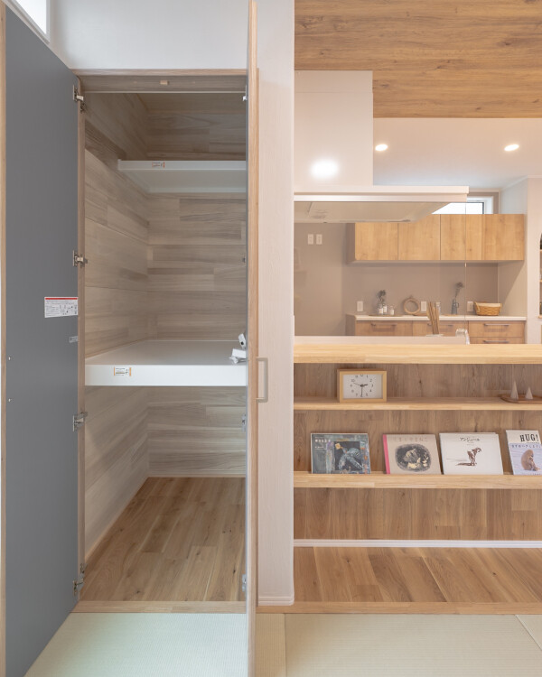 畳コーナーの奥にはミニ押入を設けました。荷物や簡易布団などをたっぷり収納でき、使い勝手も抜群です。