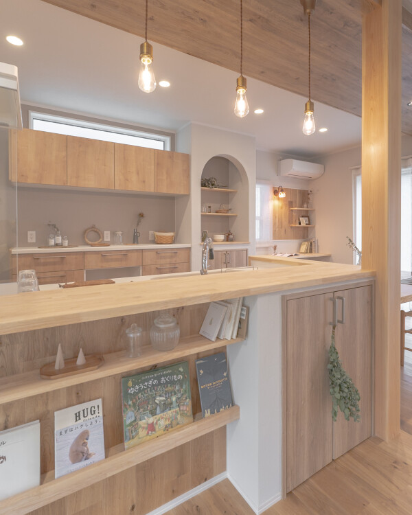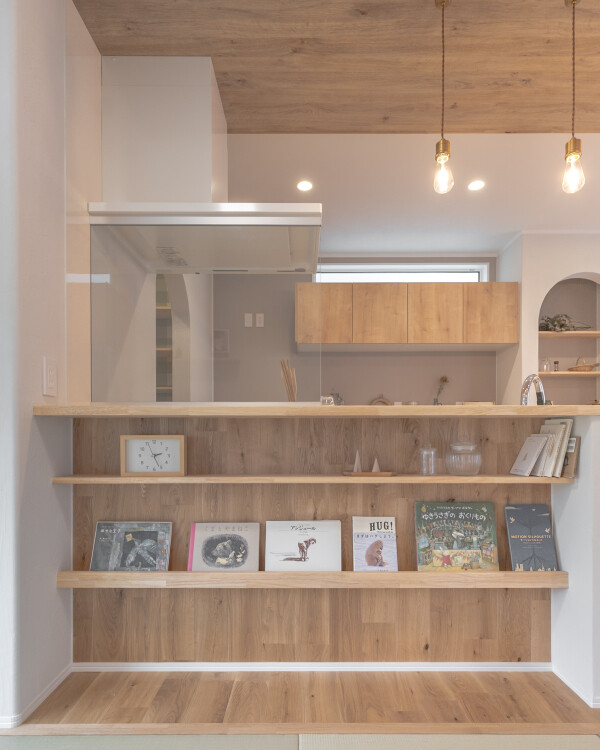 キッチンカウンターの腰壁に大きく造作した“絵本ニッチ”が主役の今回のお住まい。