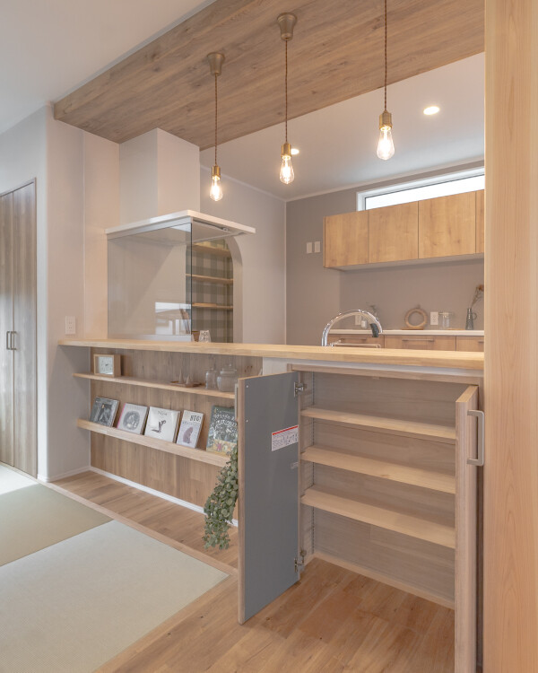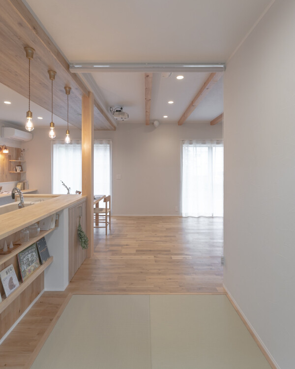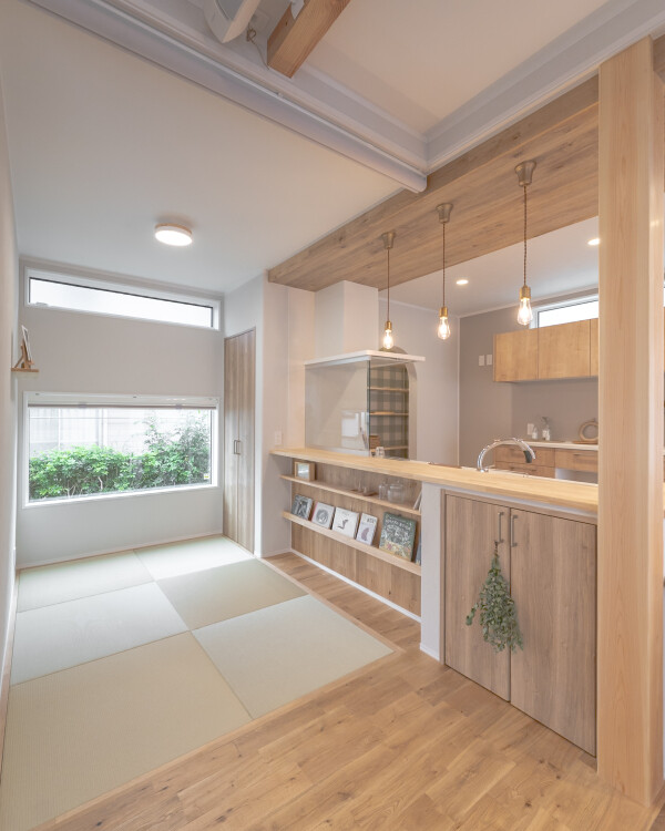 キッチンと畳コーナーの雰囲気が心地よく調和。ペンダントライトの優しい明かりがアクセントになっています。