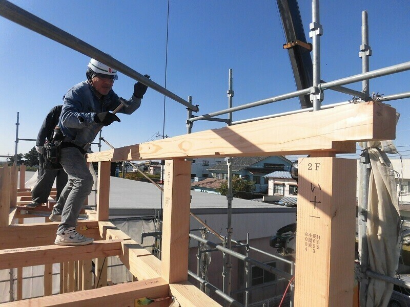 慣れないうちは梁の上を歩くのも結構怖いものですが、経験を積んだ大工さんにとってそれはお手の物。