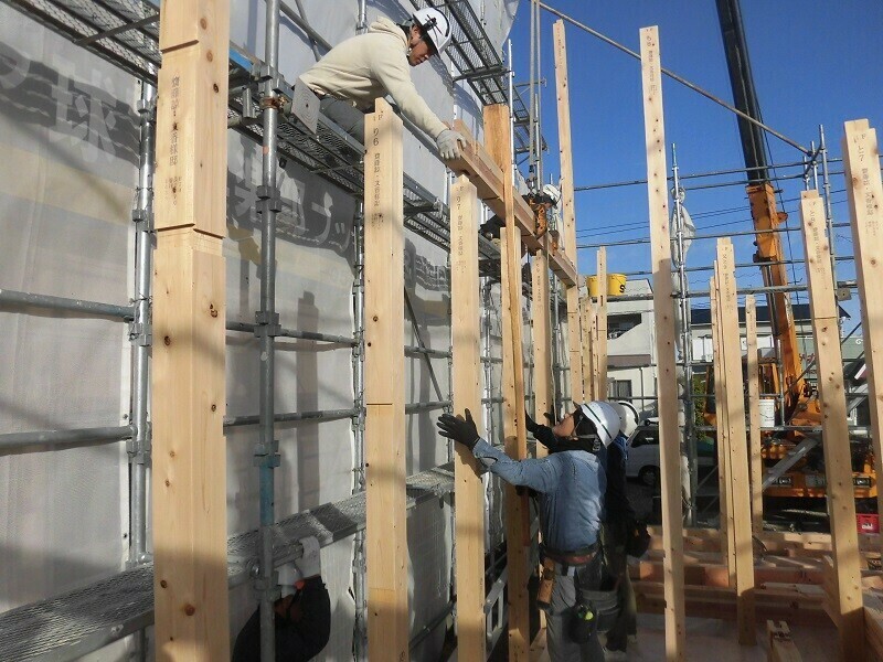 上棟日には柱や梁などの建物の基本構造となる部分の組み立て作業を大工さん数人掛かりで行います。
