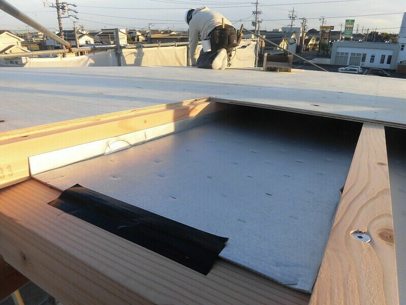 このEXハイパーですが、施工手順としてはまず寸法通りにカットして、それを外に運び出し、所定の位置に仮留めしたものを仕上げに釘打ち機で固定するという手順となります。