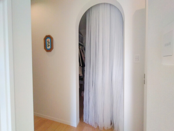 脱衣室からクローゼットへ一直線につながるアーチ垂れ壁と、そこから差し込むやさしい光…。
