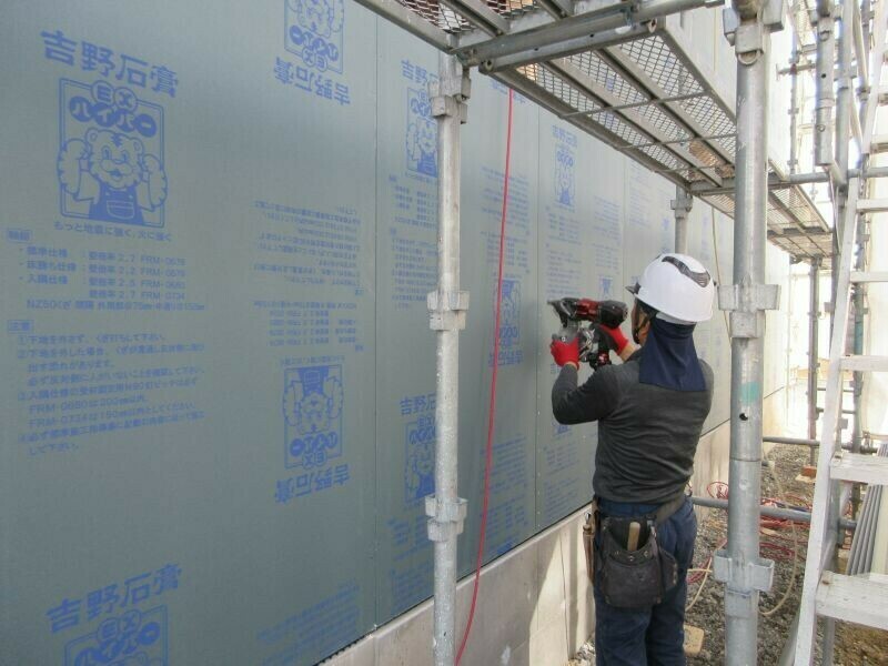 このEXハイパーですが、施工手順としてはまず寸法通りにカットして、それを外に運び出し、所定の位置に仮留めしたものを仕上げに釘打ち機で固定するという手順となります。