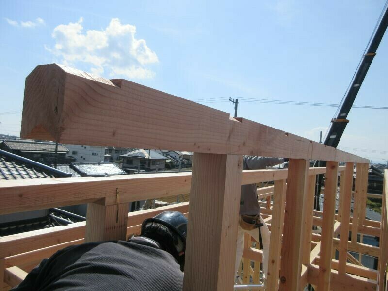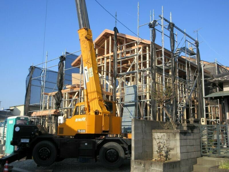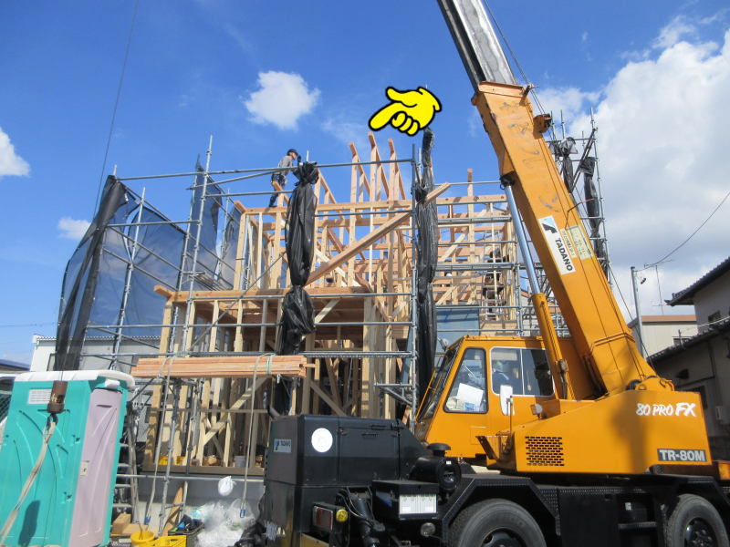 レッカー屋さんと連携を取りながら柱のほぞを梁のほぞ穴にはめ込んでいきます。