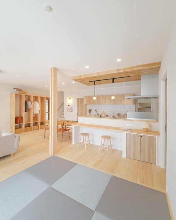 ファミリーロッカーで見せる収納を楽しむ、リビング中心の家。玄関から土間収納、キッチン、水まわりへとつながる間取りで、毎日の動きがスムーズに。暮らしやすさと心地よさを体感できる住まいです。