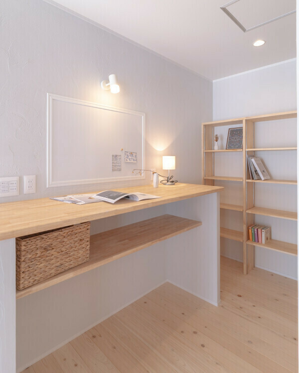 奥さまのワークスペースは、リビングの一角にありながら視線が遮られる“ちょうどいい距離感”で、作業に集中できる落ち着いた場所に。