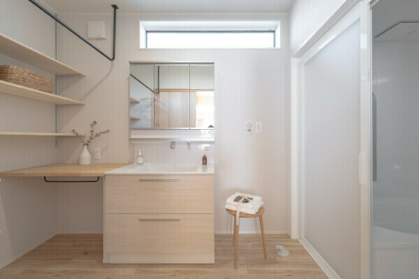 洗面脱衣室には、使い勝手の良い簡易物干し・可動棚・カウンターが完備。