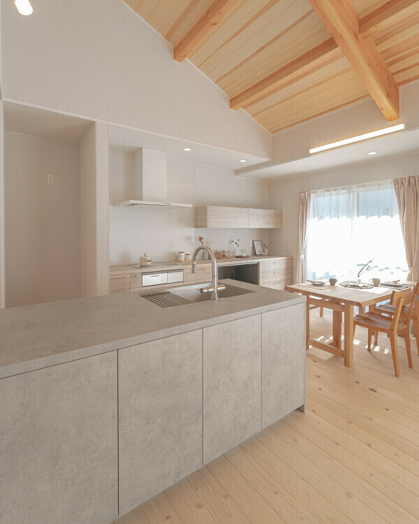 ひのき無垢床や勾配天井の梁あらわしなど、素材が引き立つ大人スタイルの空間が完成しました。