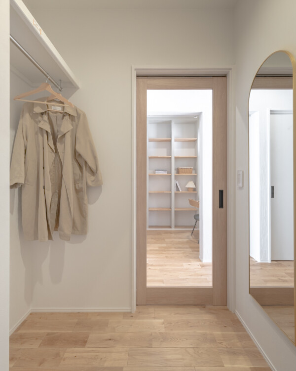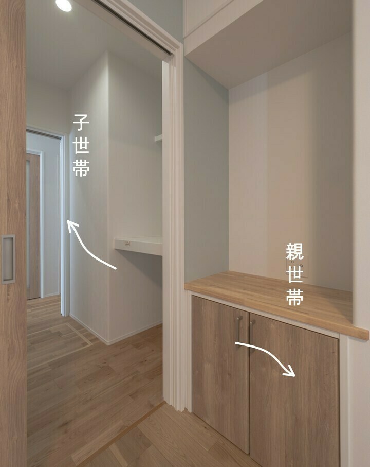 世帯間を行き来できる廊下は、納戸の中にさりげなく設けました。