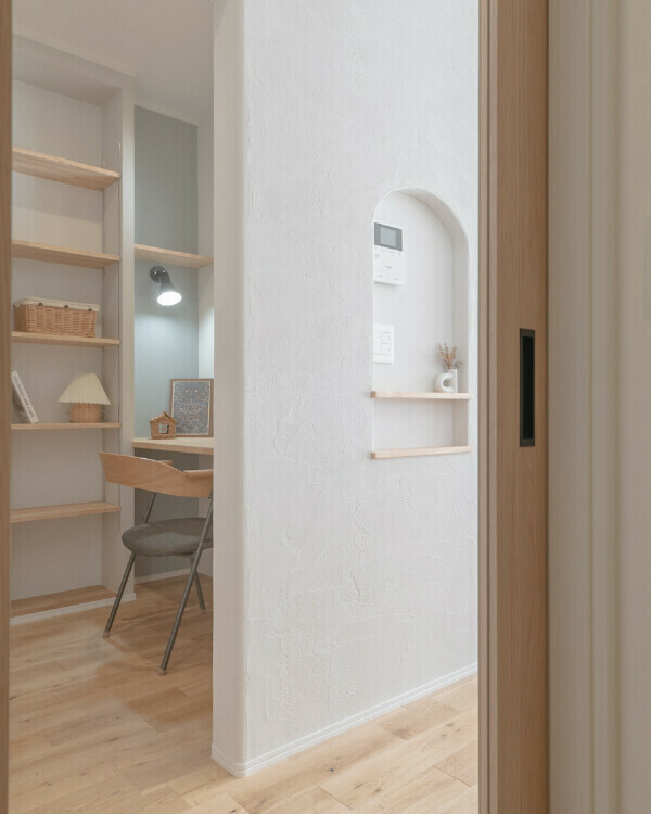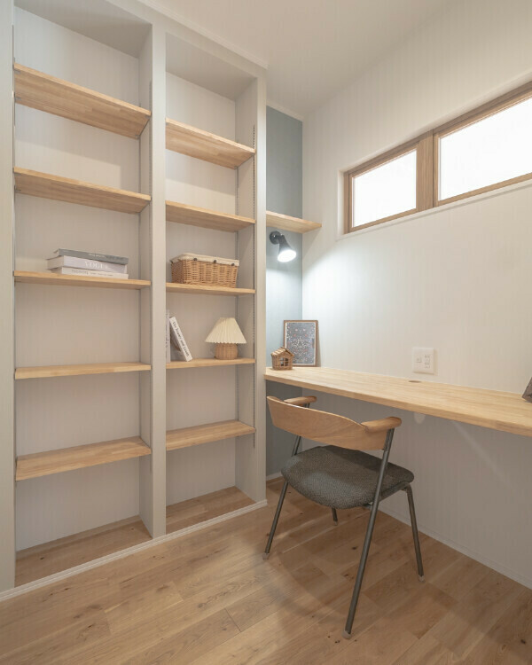 リビングとゆるやかにつながる、圧迫感のない大人シンプルな書斎。