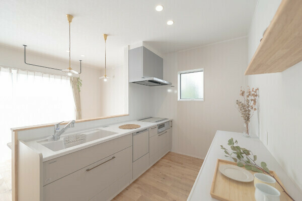キッチンはあえて壁付けにすることで、リビングからダイニングまでを広く使える開放的な空間に。