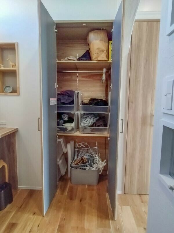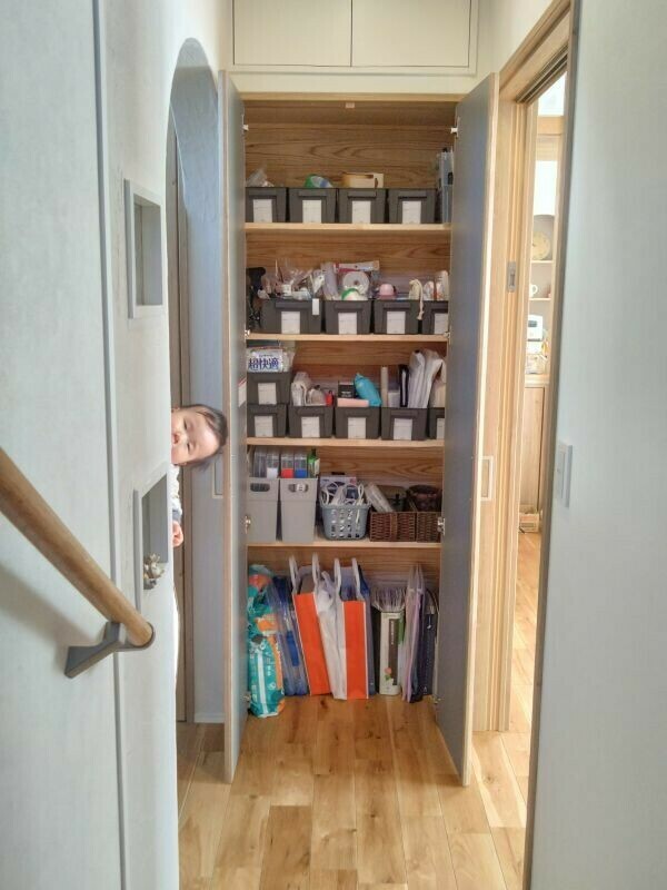 書類や小物などが整理されています。リビングと洗面の間にある物入収納は使いやすそうです。