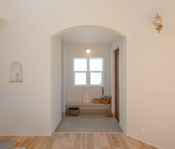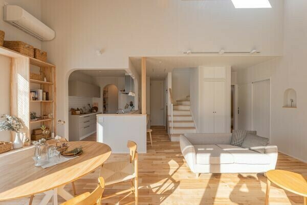 室内にあしらったアーチの垂れ壁など、やわらかな雰囲気のデザインもこのモデルハウスの見どころのひとつ。