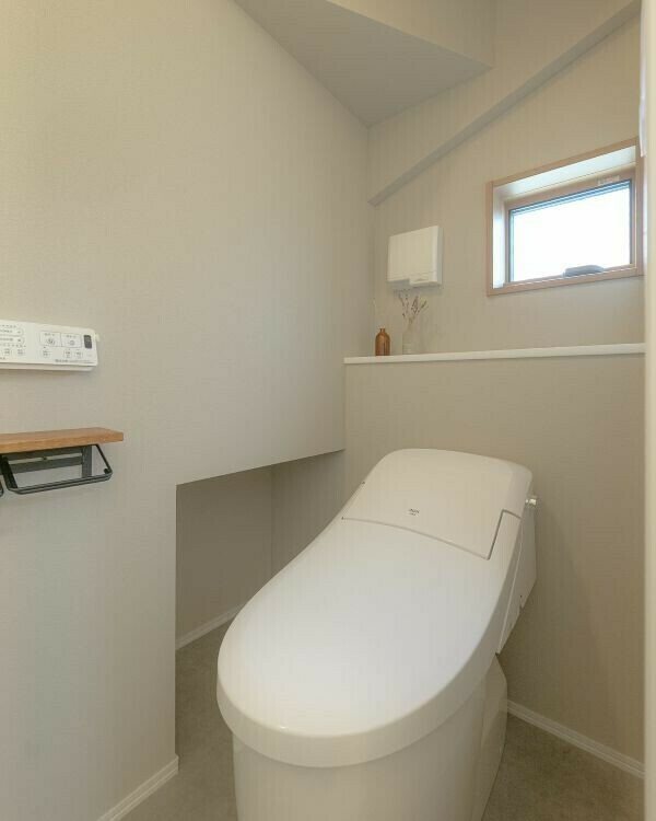1Fトイレは省スペースを利用した階段下に。窓をつけることで閉塞感を和らげました。(階段下のデッドスペースを活かした収納スペースも◎)