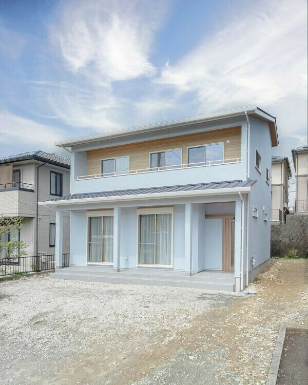 カルフォルニアスタイルを意識したデザインにしています。爽やかなブルーを基調とし、玄関やリビングからつながる屋根付きの広いデッキ(カバードポーチ)をつくりました。